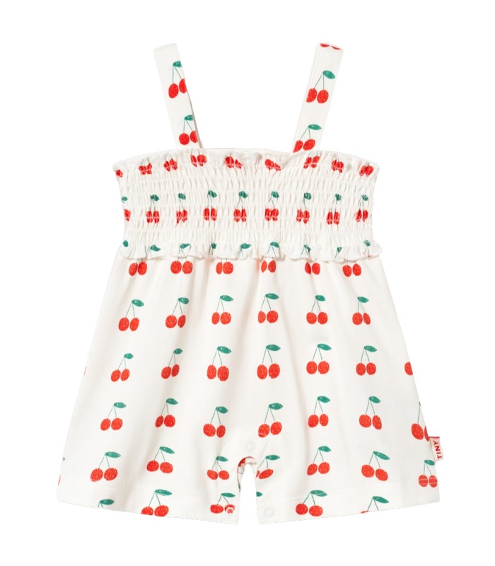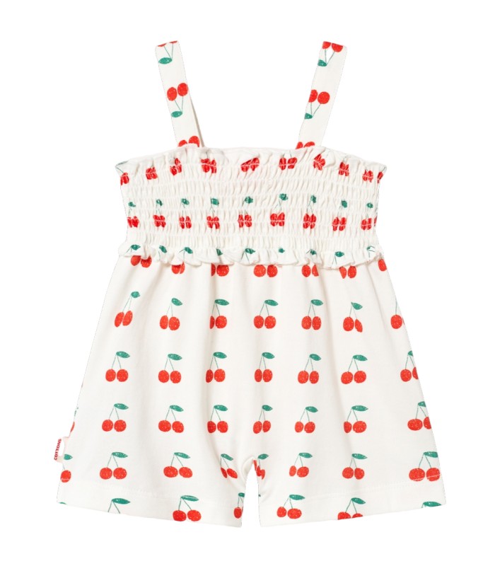Crafted from 100% organic cotton, this Cherries print one-piece combines comfort, style, and sustainability. It features a comfy, relaxed silhouette with shoulder straps and a snap buttons opening on the bottom.